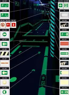 Fotoluminescencyjny znak samoprzylepny wykonany z poliwęglanu stosowany do wyznaczania drogi ewakuacyjnej i wskazywania jej kierunku.