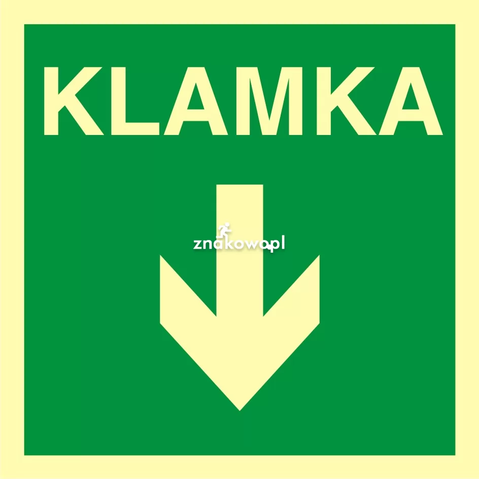 W górnej części znaku biały / żółty napis "KLAMKA". Pod napisem strzałka skierowana w dół.