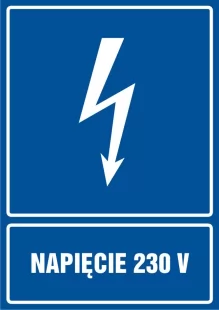 Na dole znaku biała, prostokątna obwódka (prostokąt położony na dłuższym boku; niebeiski prostokąt z cienką, białą obwódką), w środku napis: NAPIĘCIE 230 V.