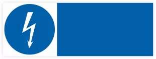 Po lewej stronie znaku niebieskie koło na białym tle. W niebieskim kole biały piktogram - błyskawica, piorun, wyładowanie prądu elektrycznego, symbol prądu, urządzenie pod napięciem.